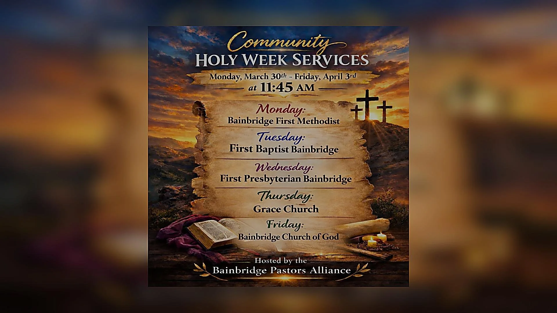 We are especially honored to host the Friday service at Bainbridge Church of God, where Pastor Ryan will be sharing a message of hope and encouragement as we reflect on Good Friday.